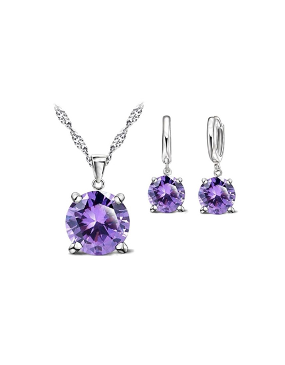 This elegant sterling silver set shimmers with deep purple hues from three brilliant-cut Amethyst solitaires.